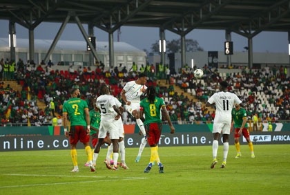 Le Syli national résiste aux assauts des Lions indomptables, mais prend un carton rouge peu avant la mi-temps avec l'expulsion de son capitaine François Kamano.