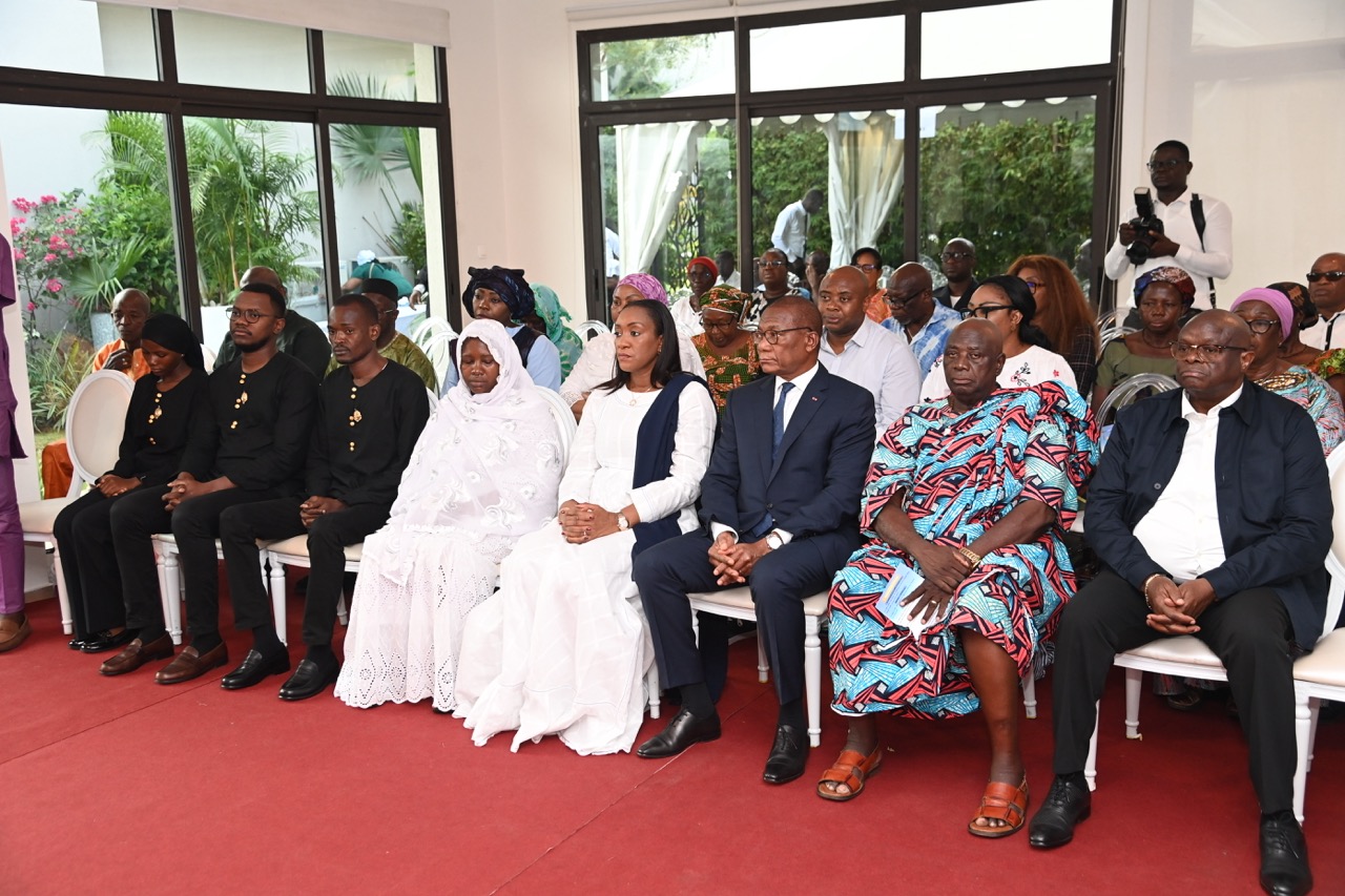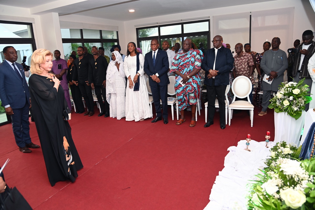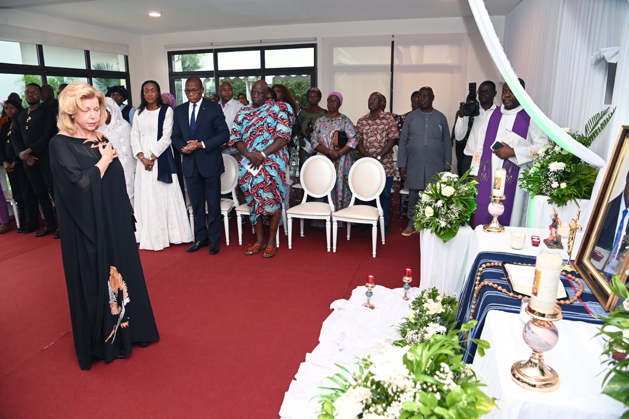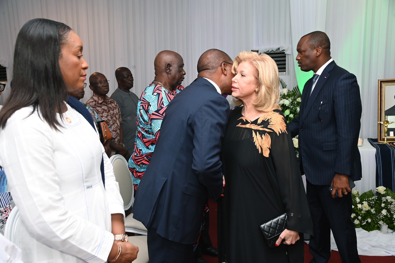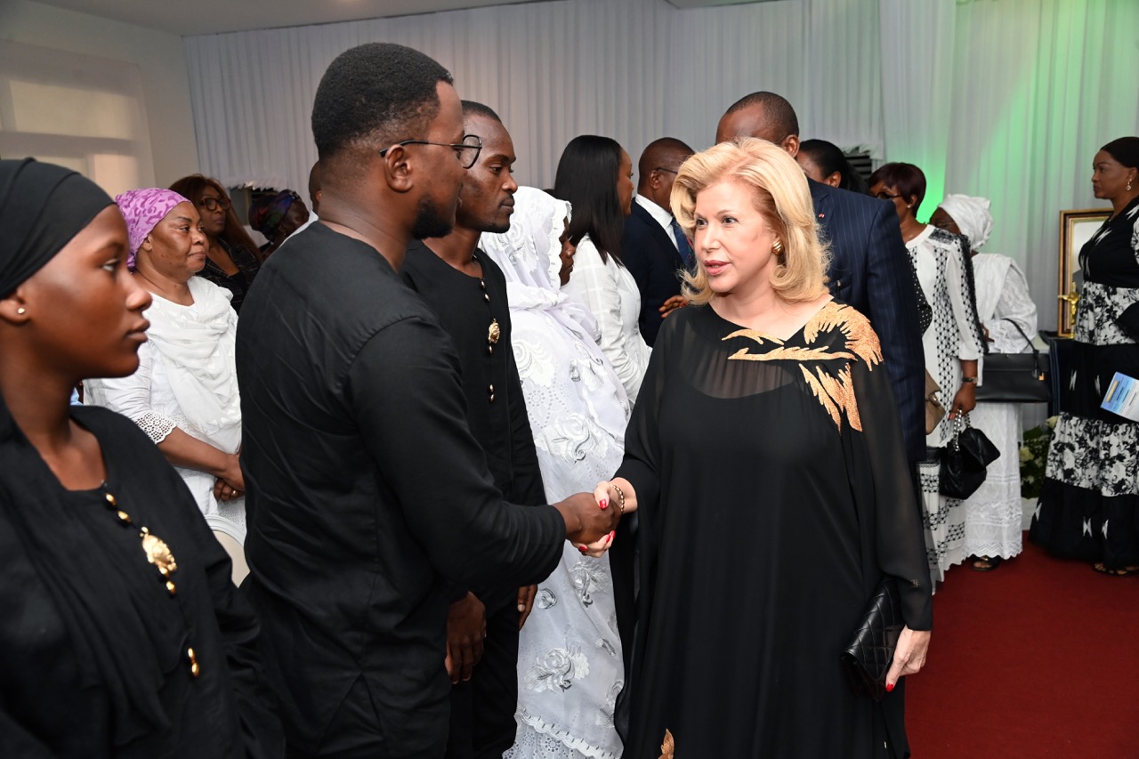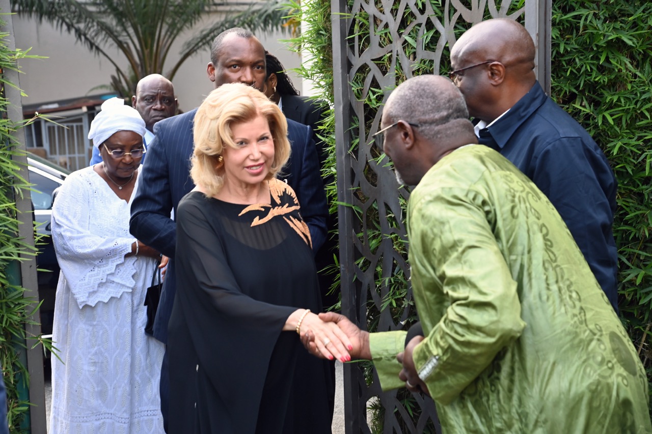 Lundi 9 février 2026. Riviera Golf (Abidjan). La Première Dame, Madame Dominique Ouattara présente ses condoléances et celles du Président au Ministre Bruno Nabagné Koné suite au décès de son frère cadet