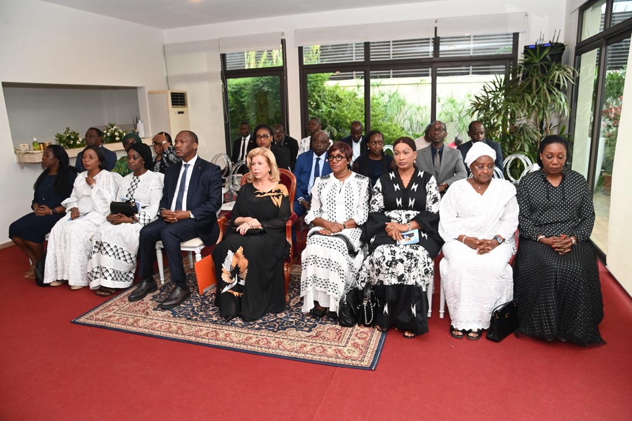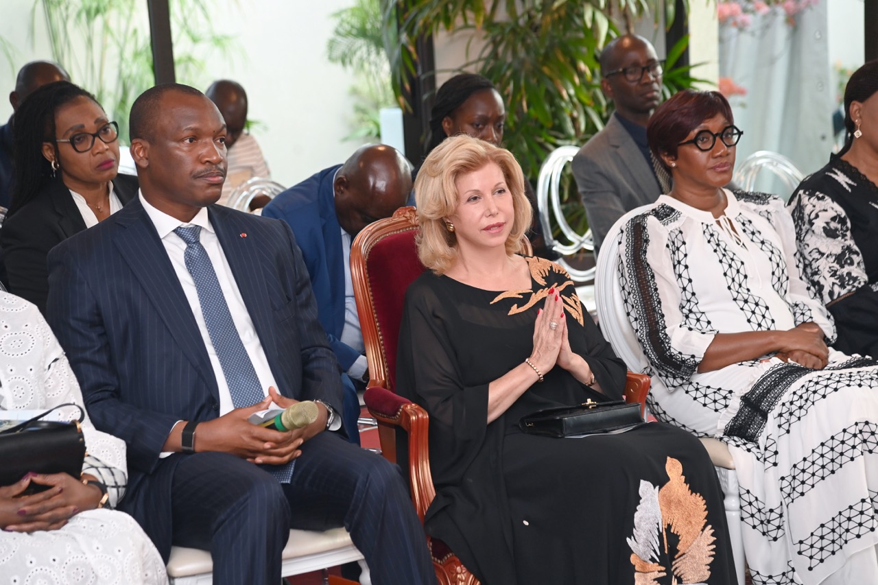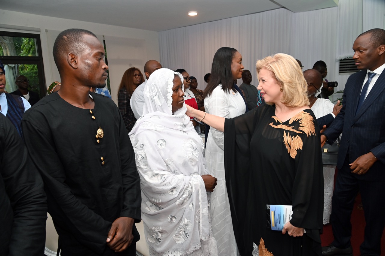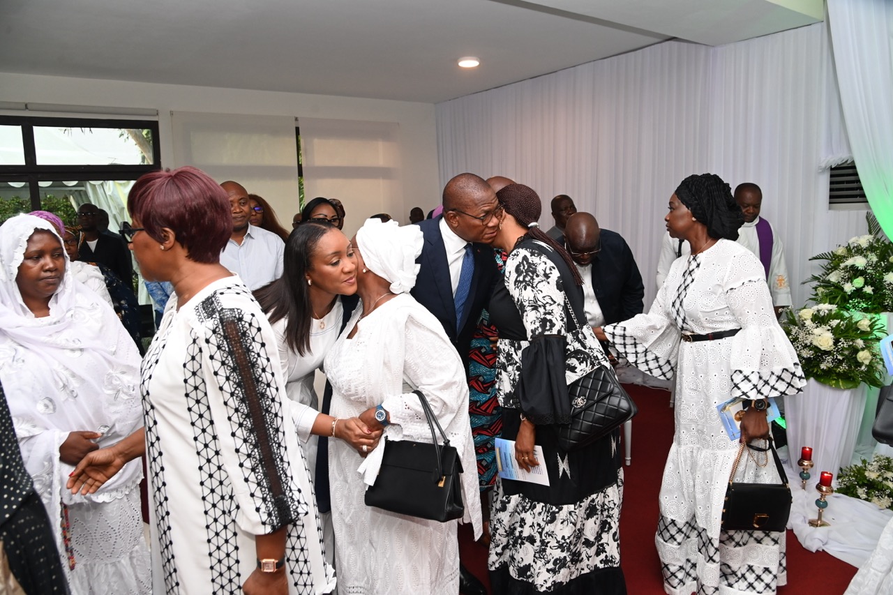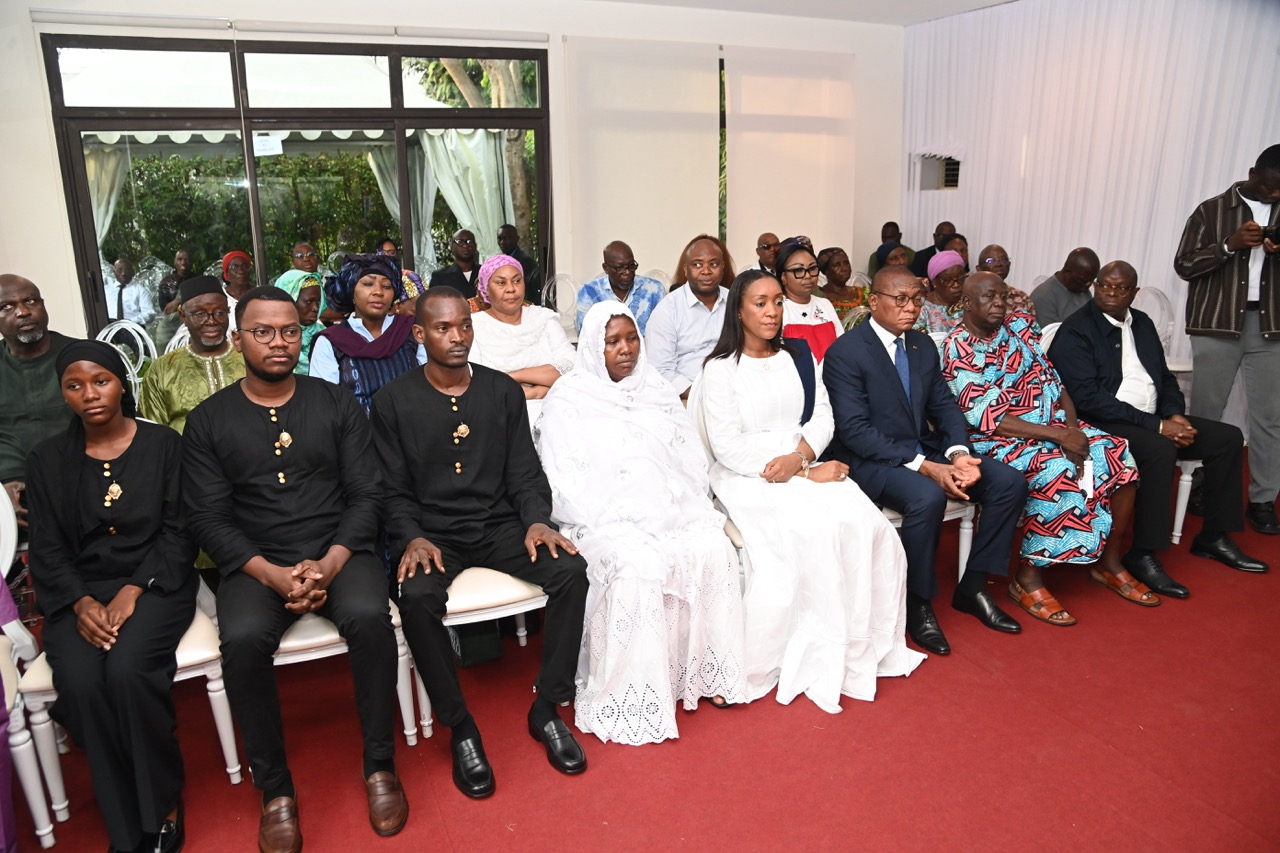 Lundi 9 février 2026. Riviera Golf (Abidjan). La Première Dame, Madame Dominique Ouattara présente ses condoléances et celles du Président au Ministre Bruno Nabagné Koné suite au décès de son frère cadet