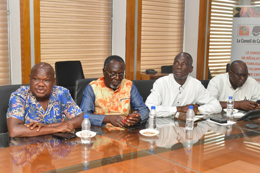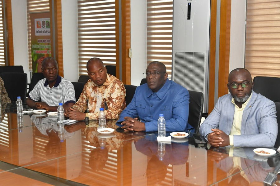 Le Président de l’Organisation Interprofessionnelle Agricole (OIA) de la filière café-cacao, Monsieur Siaka Diakité, entouré de ses vice-présidents, du secrétaire général, de son conseiller spécial et de plusieurs délégués, a tenu, ce mardi 3 mars 2026, une conférence de presse à l’immeuble de la CAISTAB pour informer sur l’avancée de l’opération de rachat des stocks de cacao.